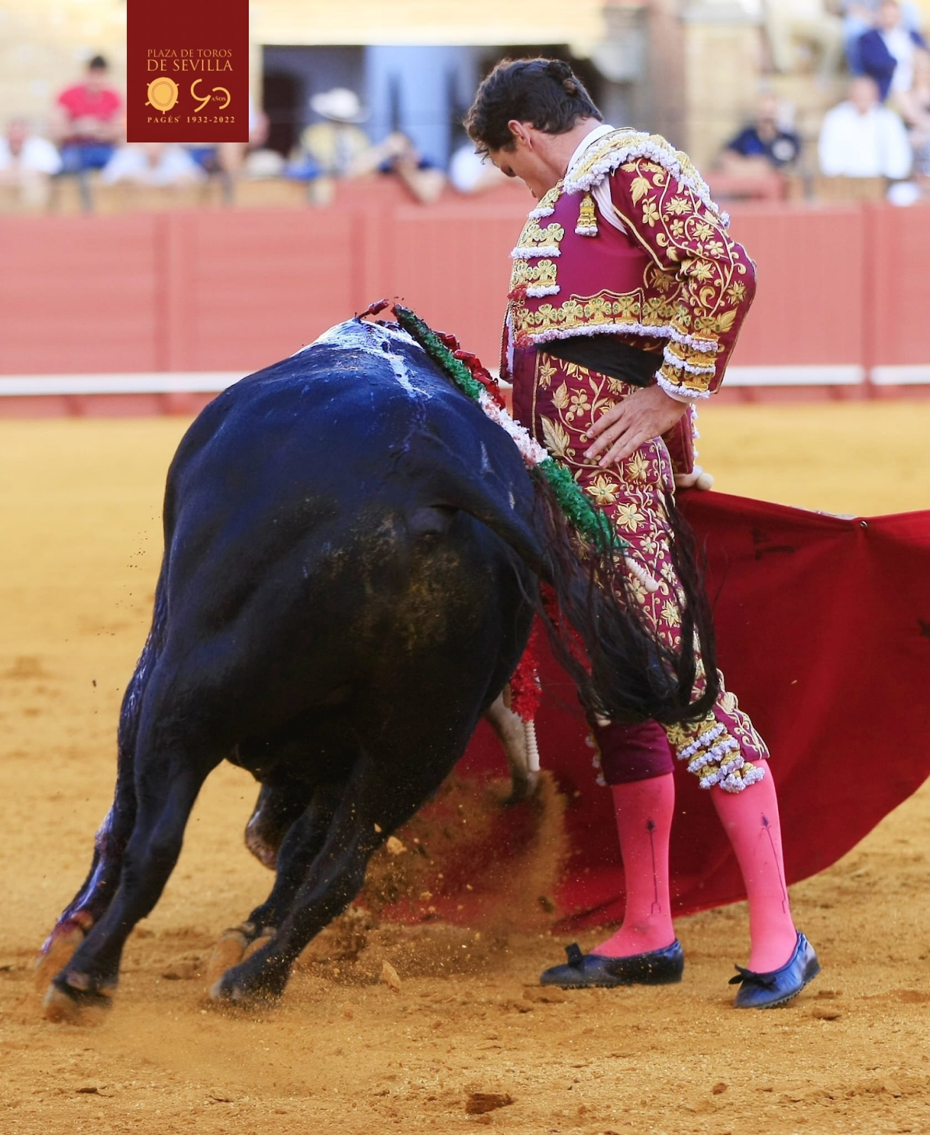 Antes de varas, pareció frágil el toro, que se arrancó de corrido al caballo con solo verlo, y apretó y recargó. Luque pareció listo para quitar, pero cambió de idea, Prefirió que el toro, pura viveza, notoria prontitud, elasticidad llamativa, siguiera moviéndose. Al salir de una segunda vara medida, enterró pitones y cobró un volatín. Vueltas de campana se habían ya pegado tres de los toros jugados por delante, y dos de ellos acusaron la lesión medular. Este quinto se alzó en un suspiro. Francisco de Manuel salió a quitar en su turno por chicuelinas, una de las suertes que en Sevilla se miran con lupa y miden hasta la exageración. No fue un quite afortunado.